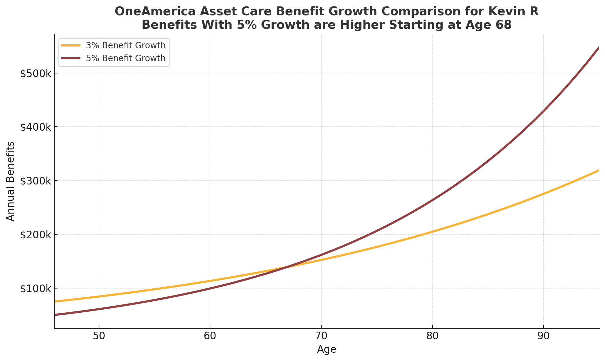 When comparing the 5% growth option to the 3% growth option, OneAmerica reaches breakeven around age 68...