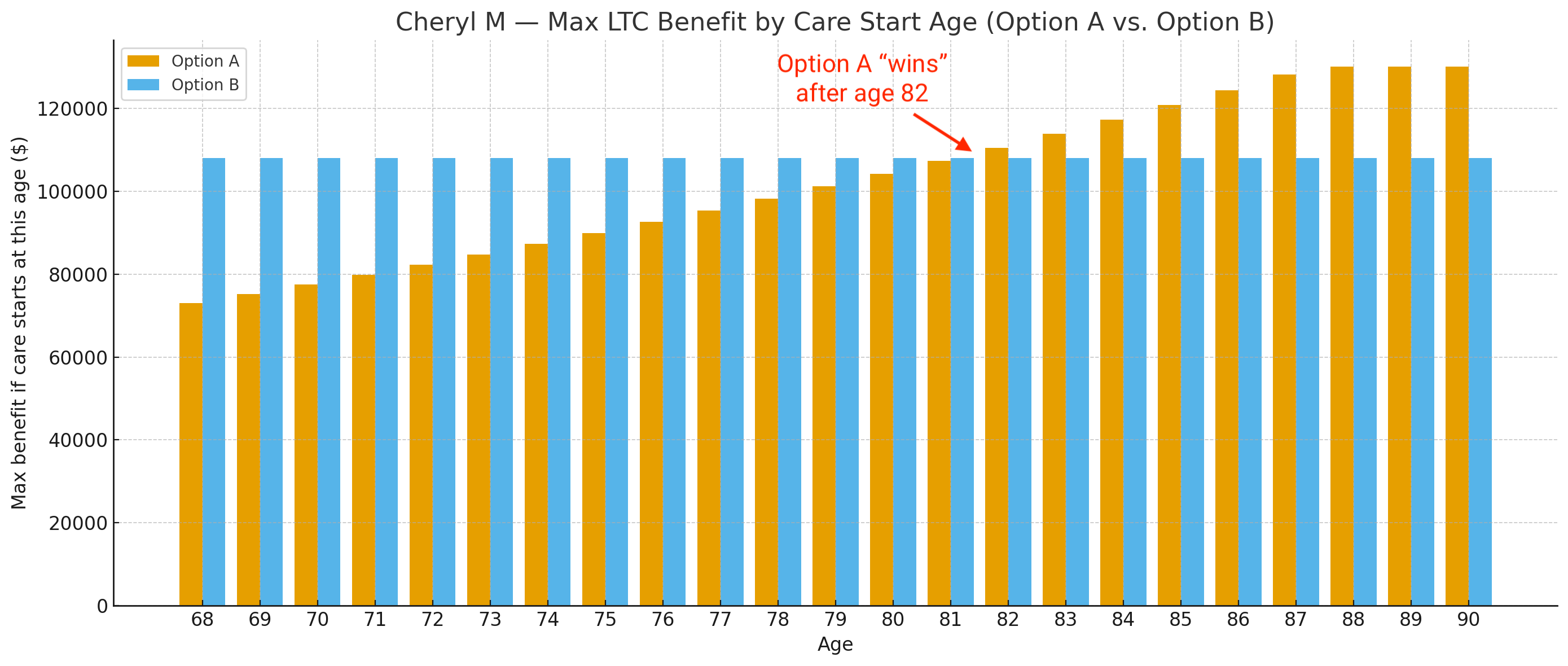 Option B – You’ll receive benefits for three years, but they stay level. If you think care may be needed before age 82, choose this option for more total coverage early on.