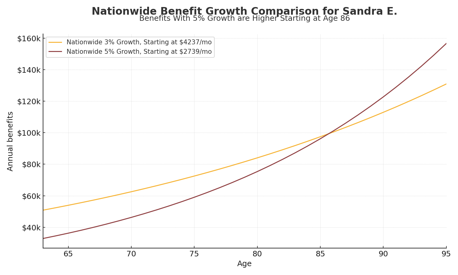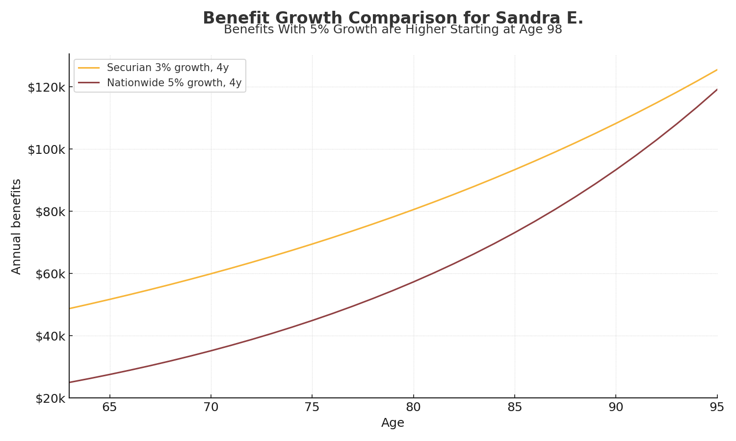 This first comparison looks at the two 3-year Nationwide policies (A2 and A3). With equal premiums, the 5% benefit growth wins after age 86.