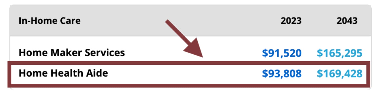 Check out this cost calculator to get a sense of local costs. For example, the median cost in Denver, Colorado, in 20 years is forecast to be $169k/year for 44 hours/week of care.