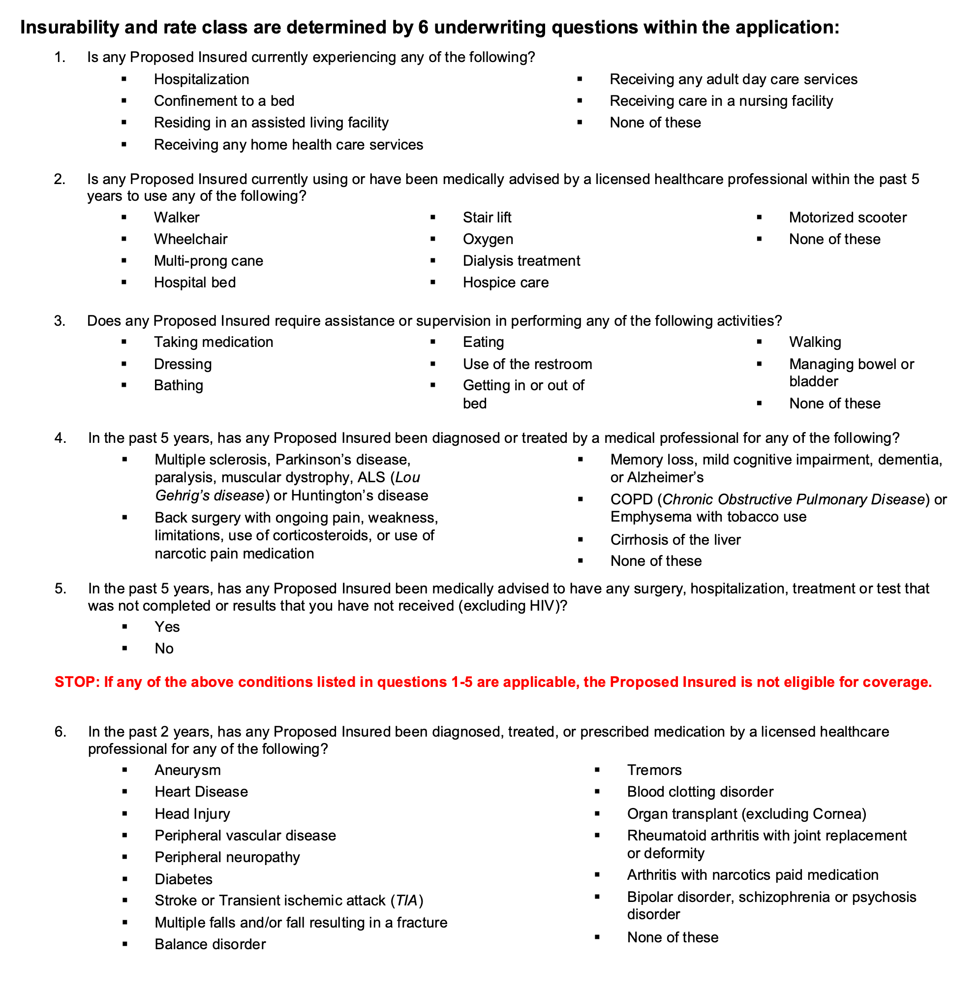 Nationwide has a few additional requirements, including height and weight guidelines, a cognitive screen for clients 70+, and a health pre-screen, but it’s more flexible than the life hybrid version of CareMatters.