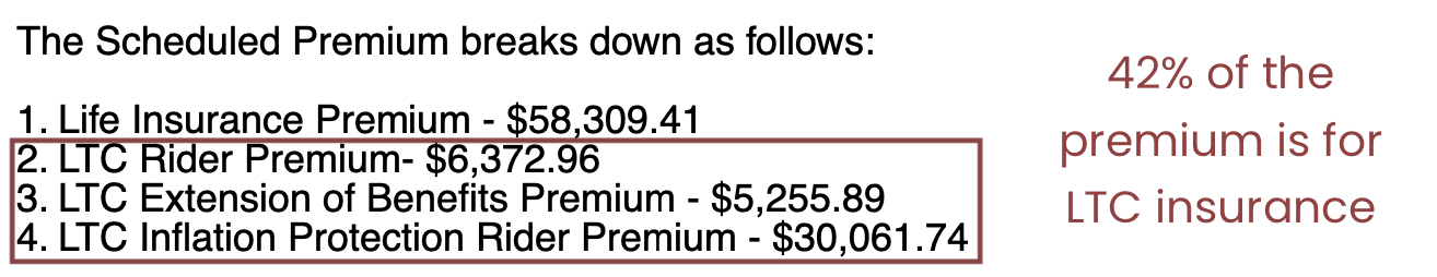 For example, if you spent $100k on this example hybrid policy, 42% of the premium is allocated to LTC and potentially deductible.