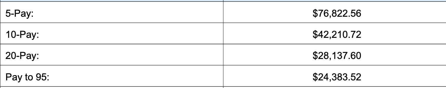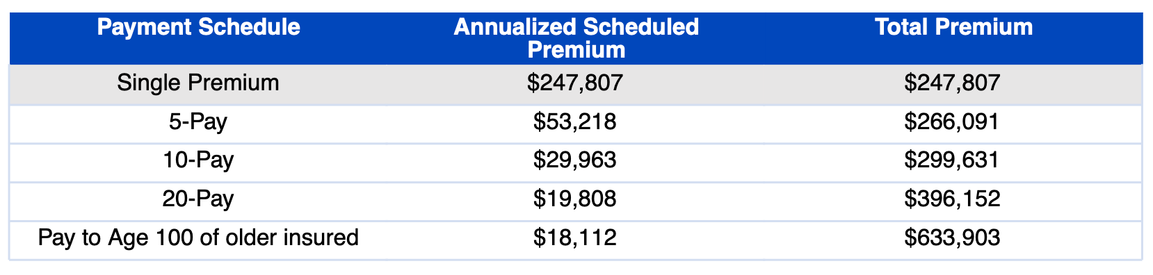 These two individual policies are slightly less than the Option A grid above, but it offers 5-year and 10-year payment schedules only. If you prefer a longer payment period, we could also look at similar individual policies with 20-pay options.